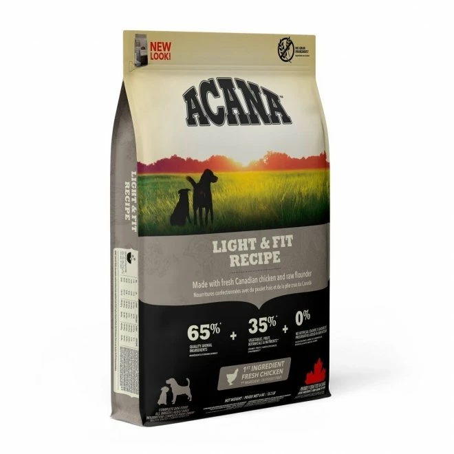 En hund som har lagt på seg litt har godt av en diett rik på proteiner. For å opprettholde muskelmasse, men ikke skape unødvendig kroppsfett, inneholder Acana Light & Fit mye kjøtt og mindre karbohydrater. Kjøttet kommer fra frittgående kylling og villfangst. For å fremme sunt blodsukkernivå er fôret fritt for høy-glykemiske ingredienser som ris, korn og poteter. I stedet inneholder den friske lav-glykemiske frukter og grønnsaker, inkludert gresskar og squash. Foringen er en del av Acana Heritage Series. Oppskrifter består av opptil 75% kjøtt, som er opptil dobbelt så mye som de fleste spesialmatvarer til hunder, og helt uten planteprotein konsentrater. En tredjedel av kjøttet er fersk, noe som legger til viktige næringsstoffer mens to tredjedeler tørkes for å bli en sterk og naturlig kilde til kjøttprotein.