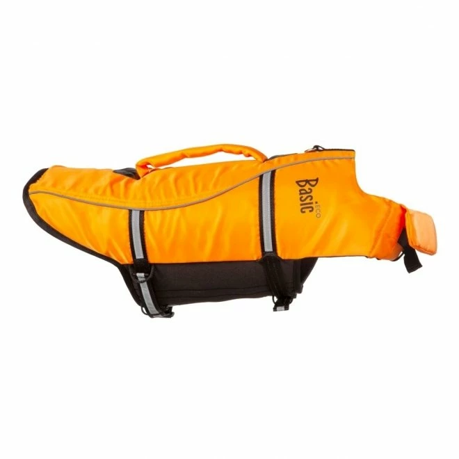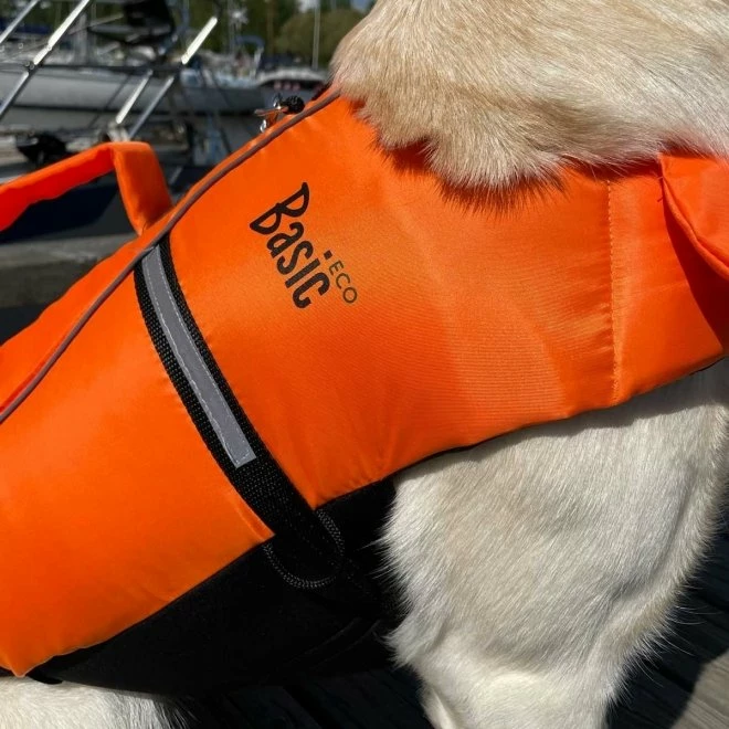 Redningsvest Eco oransje er lett å ta på og passe flere ulike kroppstyper ved hjelp av de justerbare stroppene. De vide magestroppene i neopren holder vesten på plass og gjør den komfortabel for hunden å ha på. Vestens sterke oransje farge og refleksdetaljer gjør at vesten er godt synlig.