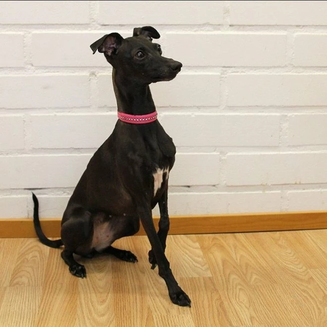 Det er justerbart og lett og passer derfor til fra helt små til middels store hunder og valper. En solid spenne gjør halsbåndet solid og får strasspynten frem.
