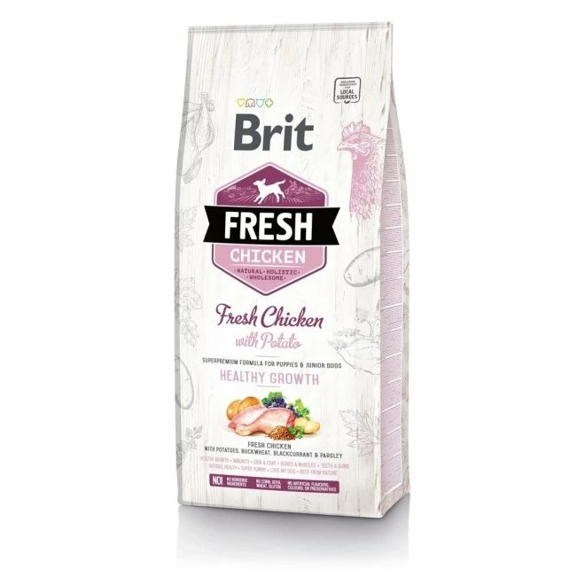 Brit Fresh Chicken with Potato Puppy Healthy Growth er et holistisk produsert valpefôr. Fôret inneholder 40% fersk kylling og gir din valp alt den trenger for å vokse seg sunn og sterk. Fôret fremmer blant annet utviklingen av immunforsvaret og oppbygging av sunne muskler, ledd og tenner. Det høye innholdet av ferskt kjøtt gjør fôret ekstra velsmakende.