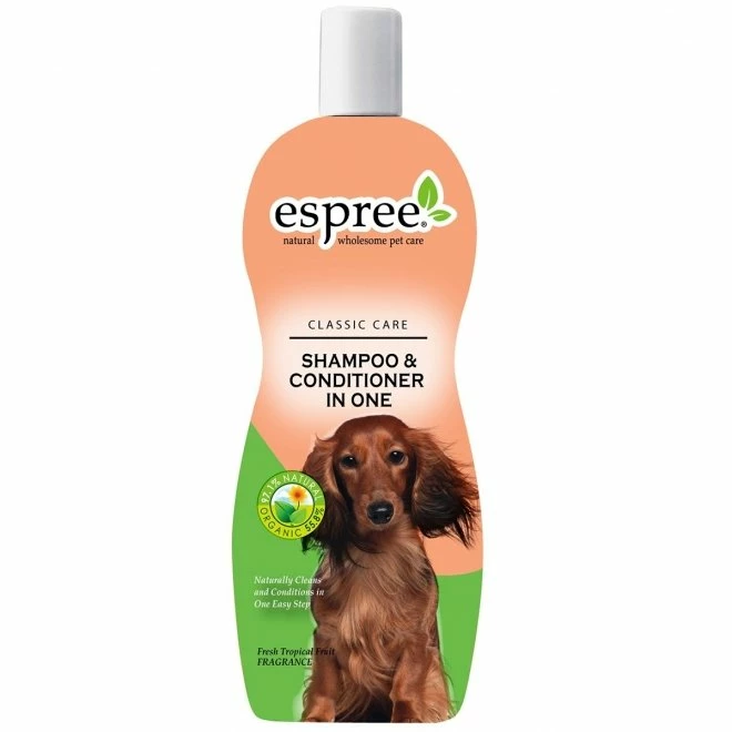 Hvorfor bruke tid og penger på flere pleieprodukter til kjæledyret? Vi har én flaske til alt dette; Espree Shampoo&Conditioner in one. En sammensetning av kokosnøtt, Aloe Vera og jojoba som renser, pleier og gir glans samtidig på en enkel måte. Lettelse i en travel hverdag!