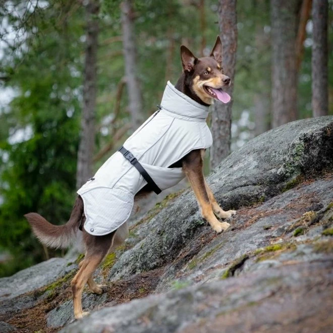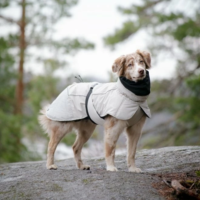 Denne stilige hundejakken har en fin lys beige / naturlig hvit farge, og holder hunden varm på kalde vinterdager! Jakken er spesielt utviklet med tanke på det kalde nordiske klimaet.