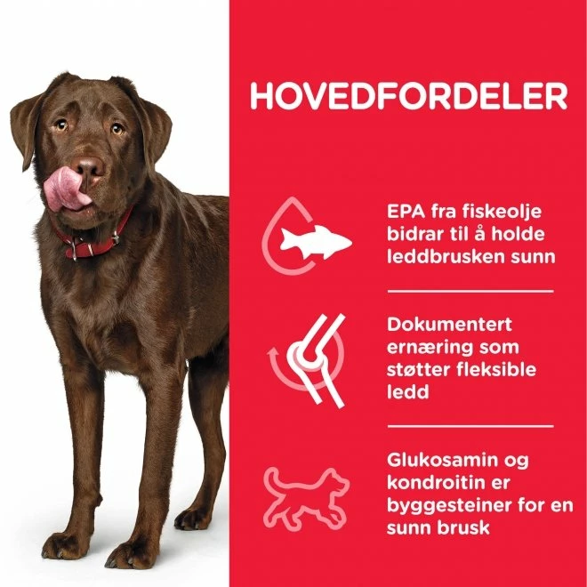 Hill’s Science Plan Dog Adult Healthy Mobility Large Breed Chicken er et hundefôr som er tilpasset for å bidra til økt bevegelighet hos voksne hunder av store raser. Hill’s Healthy Mobility inneholder Omega 3-fettsyrer, antioksidanter og næring som bidrar til å bevare hundens bevegelighet. Hundefôrets biter er spesielt utformet for å passe den store hunden og stimulerer hunden til å tygge skikkelig.