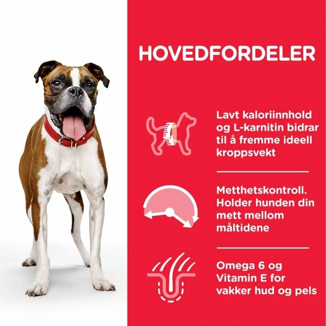 Hill’s Science Plan Dog Adult Medium Light Chicken er planlagt for å opprettholde idealvekten. Klinisk testede antioksidanter og L-karnitin hjelper med å omforme fettet til energi.Maten inneholder 40 % mindre fett enn normalt og 18 % mindre kalorier enn normalt (sammenlignet med Hill’s Science Plan Advanced Fitness-maten). Det høye fiberinnholdet holder sulten borte mellom måltidene. Delikat smak.