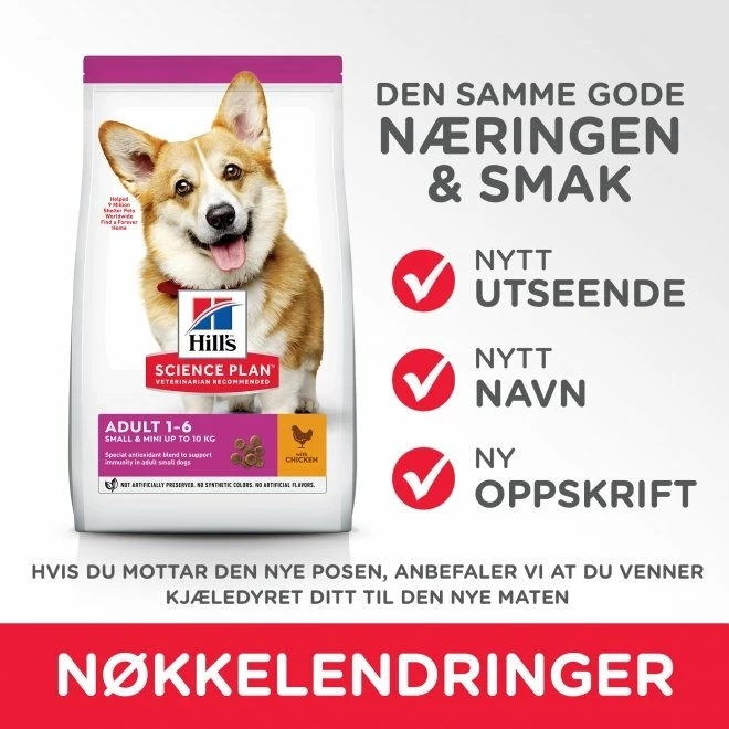Hill’s Science Plan Adult Small & er et balansert hundefôr som er spesielt tilpasset hunder av små raser mellom 1-6 år. Hundefôret inneholder antioksidanter som fremmer immunforsvaret og et langt og sunt liv. Den høye kvaliteten på ernæringen i fôret bidrar til en sunn hud og myk og skinnende pels.
