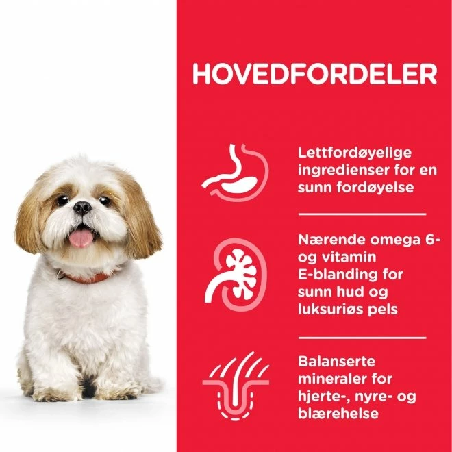 Hill’s Science Plan Dog Mature 7+ Small & Mini er et velsmakende hundefôr for eldre hunder av små raser. Hundefôret er spesielt tilpasset for at hundens bevegelighet og muskelmasse skal bevares samtidig som hundefôret støtter god helse i den eldre hundens vitale organer. Hill’s Science Plan Dog Mature 7+ Small & Mini inneholder naturlig glukosamin og kondroitin som aktivt støtter hundens ledd og bevegelighet. Hundefôret bidrar også til at hundens muskemasse bevares gjennom innhold av høykvalitets proteiner og L-karnitin.