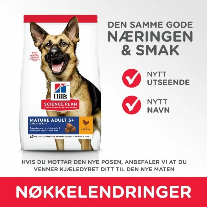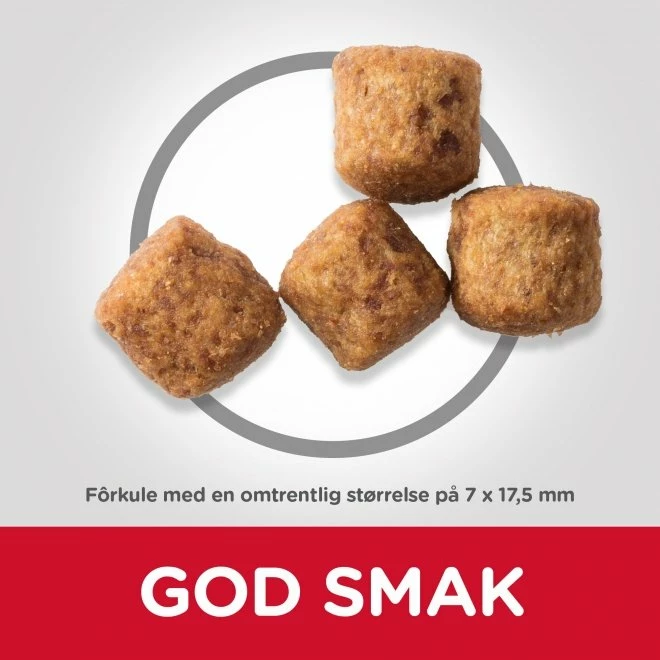 Hill’s Science Plan Dog Mature Large Breed Chicken er et velsmakende hundefôr for eldre hunder av store raser. Hundefôret er spesielt tilpasset for at hundens bevegelighet og muskelmasse skal bevares samtidig som hundefôret støtter god helse i den eldre hundens vitale organer. Hill’s Science Plan Dog Mature Large Breed Chicken inneholder naturlig glukosamin og kondroitin som aktivt støtter hundens ledd og bevegelighet. Hundefôret bidrar også til at hundens muskemasse bevares gjennom innhold av høykvalitets proteiner og L-karnitin.