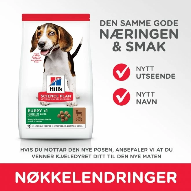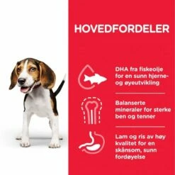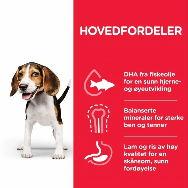 Hill’s Science Plan Puppy Medium Lamb & Rice er et velsmakende hundefôr som er spesielt tilpasset valper av alle raser opp til 12 måneders alder samt drektige og ammende tisper. Hundefôret inneholder høykvalitets protein fra lettfordøyd lammekjøtt samt ris som karbohydratkilde. Hill’s Science Plan Puppy Medium Lamb & Rice har tilskudd av Omega 3 og Omega 6 for å gi valpen smidig og frisk hud samt blank pels. Hundefôret er fritt for hvete, hvetegluten, melkeprodukter og andre ingredienser som kan forårsake fôrallergier. Fôret er også fritt for kunstige fargestoffer, smakstilsetninger og konserveringsmiddel.