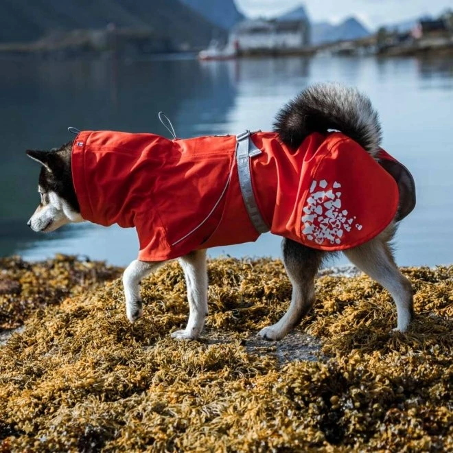 Hurtta Monsoon er et perfekt regndekken for alle hunder som vil ut i regn, vind eller kjølig vær. De teipede sømmene sørger for at dekkenet er motstandsdyktig mot vann, vind og smuss. Kragen kan justeres slik at hundens nakke og bryst er beskyttet. Det brede magepartiet holder hundens mage fri for vann og smuss, og holder også dekkenet på plass under fartsfylt lek! De store refleksdetaljene bak og på ryggen gjør dekkenet synlig i mørket.