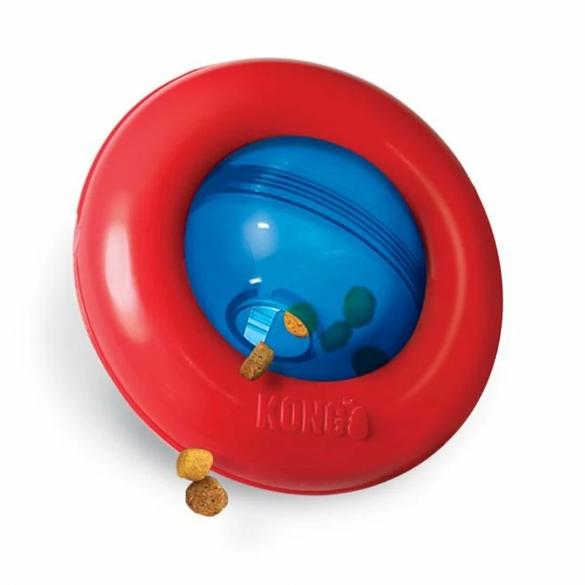 Her har du et leketøy som underholder hunden lenge. Den blå ballen i midten snurrer mens den røde ringen står stille. Legg i godteri som hunden får forsøke å få ut gjennom det lille hullet. Passer perfekt til selvstendig lek (selvfølgelig under overvåkning).