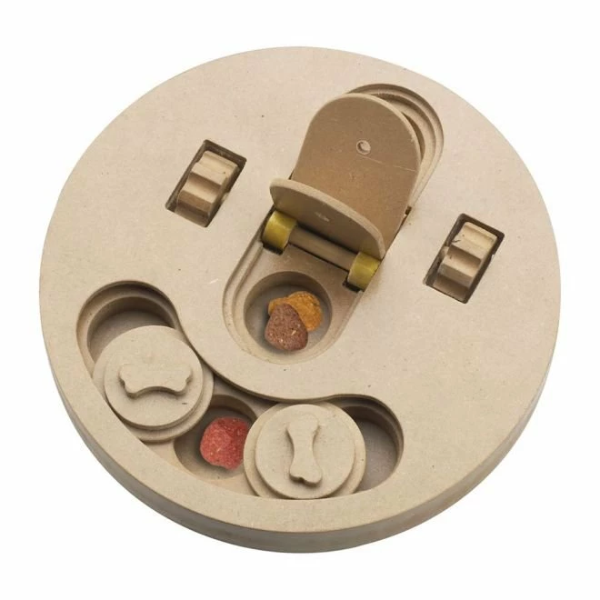 Hunden din kommer til å elske dette morsomme aktiviseringsspillet der både luktesans og hjerne settes i spinn. Alt som behøves er deg, hunden din, litt fôr eller godbit og så kan spillet starte! Ta litt mat og legg i spillets luker, lukk dem og sett spillet på gulvet, nå kan skattejakten starte! Med luktesansen kan hunden kjenne at det finnes mat der, men hvorô Med poter og snute kan hunden finne godbitene For å utfordre hunden litt ekstra kan man bruke regler som at hunden ikke får bite, da avbrytes spillet og når hunden har roet seg kan spillet fortsette. Little & Biggers Seak-a-treat Flip’n’flap er et perfekt spill for å aktivisere og underholde hunden din.