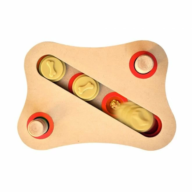 Spillereglene er enkle. Det behøves to spillere, du og hunden din. Gjem tørrfôr eller godbiter og la hunden din lete med snute og pote for å komme til dem. Du kan hjelpe hunden din i gang ved å la den se på når du fyller aktiviseringsleken med tørrfôr eller godbiter og lar lukene stå litt på gløtt. Hvis hunden opplever frustrasjon og ikke virker å forstå, gå litt tilbake og gjør det lettere igjen. Ha alltid oppsyn med hunden din under lek med leker eller aktiviseringsleker. Unngå at hunden tygger på leken. 29 x 19 cm.