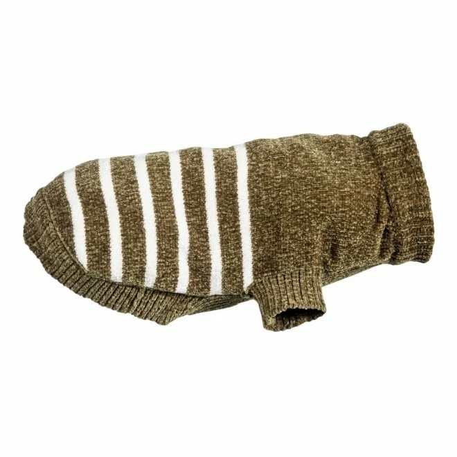 Denne stilige, grønne strikkegenseren med striper er kjempekomfortabel for hunden å ha på. Den er laget av mykt chenillegarn.