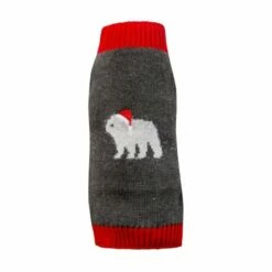 Little&Bigger Xmas Hundegenser Isbjørn er en grå strikkegenser med fine røde detaljer og en isbjørn med nisselue på ryggen. Den er uten ermer.