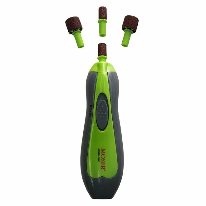 Mosers Nail Grinder er en klosliper som passer hunder i alle størrelser. Den hjelper deg med å slipe ned klørne på din hund på en stille og praktisk måte. Klosliperen er batteridrevet (batterier inngår) og kommer med fire ulike slipehoder (to store og to små). Med fire hastigheter (to framover og to bakover) kan du selv anpasse hastigheten etter behov. Klosliperen har en mini-lampe foran for økt sikkerhet og for å gjøre det lettere å slipe. Tenk på at du ikke skal slipe for langt ned, da dette kan gjøre vondt og kan medføre komplikasjoner for hunden. Slip litt og ofte, og husk å belønne hunden din godt under og etter slipingen.