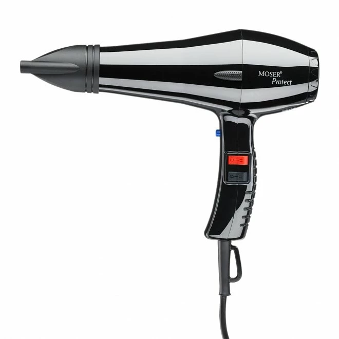 Moser Protect er en ergonomisk og praktisk hårføner med non-slip håndtak til daglig bruk. Hårføneren er av høy kvalitet med pålitelig motor og avtagbart filter for enkel rengjøring. Den har to hastigheter, tre varmenivåer samt en knapp med rask tilgang til kaldluft. Med 1500 W, 2,8 meter ledning og lav vekt (530g) blir hårføneren fort en favoritt. Det inngår to forskjellige munnstykker (lang pels / standard).