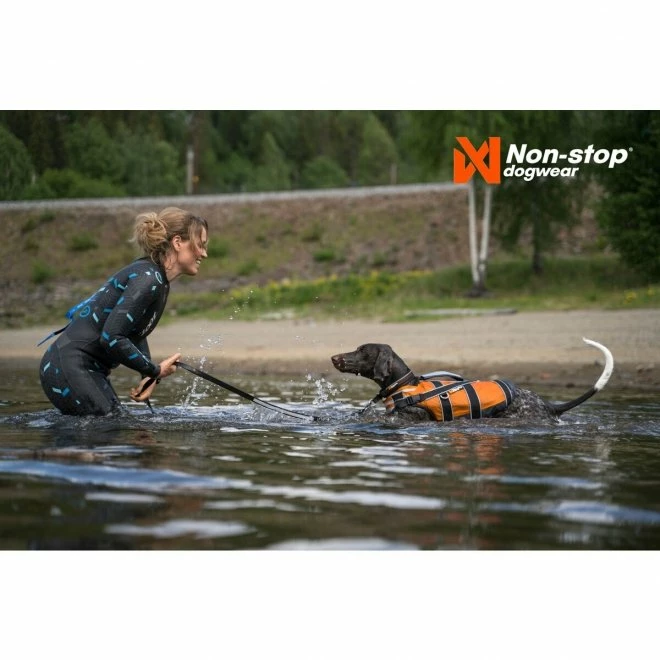 Redningsvesten har en sterk farge og 3M™ reflekterende detaljer som gjør det enkelt å få øye på hunden. I ringen på ryggen kan det festes en lang line for når du er i båt, kano eller lignende, eller for når du ønsker mer kontroll over hunden din. Redningsvesten har også en lomme hvor man kan oppbevare båndet når det ikke er i bruk.