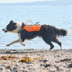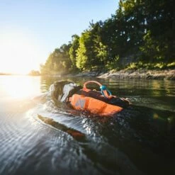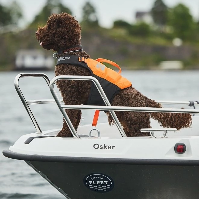 På ryggen er det et håndtak som du kan bruke til å hjelpe hunden i vannet eller opp på kaien/båten.