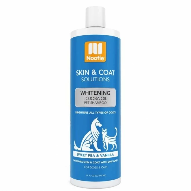 Nootie Whitening Jojoba Oil Sjampo – Sweet Pea Vanilla gjør hvit pels enda hvitere og andre farger klarere. Den friske duften av sukkererter og vanilje holder seg lenge i pelsen. Fjerner vanskelige flekker og olje uten blekemiddel eller kraftige kjemikaler.