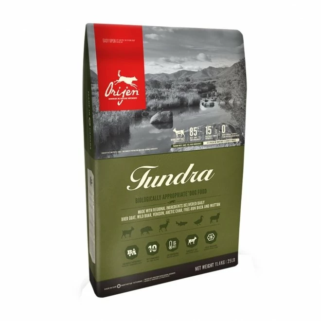 Våre hunder stammer fra ulven, de er jegere som er tilpasset en kjøttrik og karbohydratbegrenset diett som inneholder en variasjon av ferskt kjøtt. Derfor har Orijen Tundra et kjøttinnhold på hele 85%. Kjøttet kommer fra fersk geit, villsvin, vilt, arktisk røye, frittgående and og lammekjøtt. Fôret er helt fritt for syntetiske tilsetningsstoffer og kunstige konserveringsmidler, kun sink er tilsatt. Fôret er også fritt for korn, og det lave innholdet av karbohydrater kommer fra frukt, grønnsaker og urter. Tundra inneholder elementer av forsiktig frysetørket lever som naturlig øker smaken, noe som gjør fôret uimotståelig, selv for den mest kresne hunden