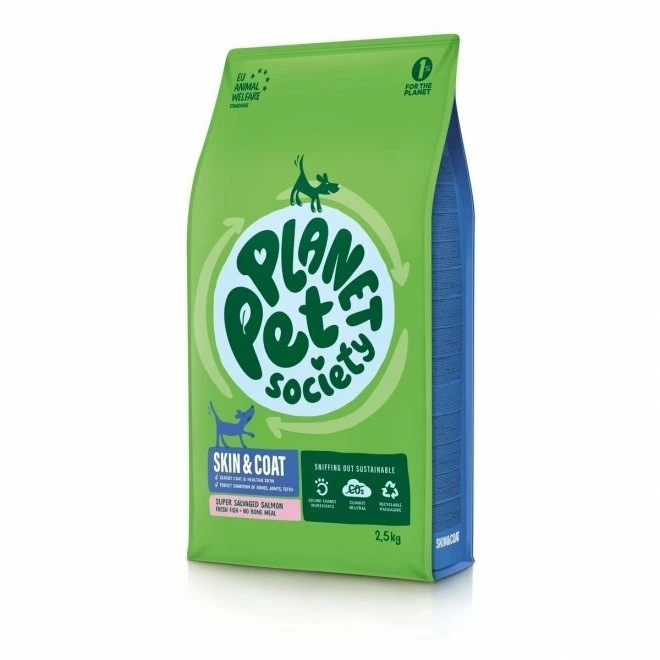 Planet Pet Society Dog Skin & Coat Salmon er et miljøvennlig hundefôr som fremmer en sunn hud og pels hos middels aktive voksne hunder. Det inneholder ferske laksebiter som ikke er blitt brukt i produksjonen av menneskemat. På denne måten går ingenting til spille! Det blir også brukt andre rester som eggeskall og epleskall.