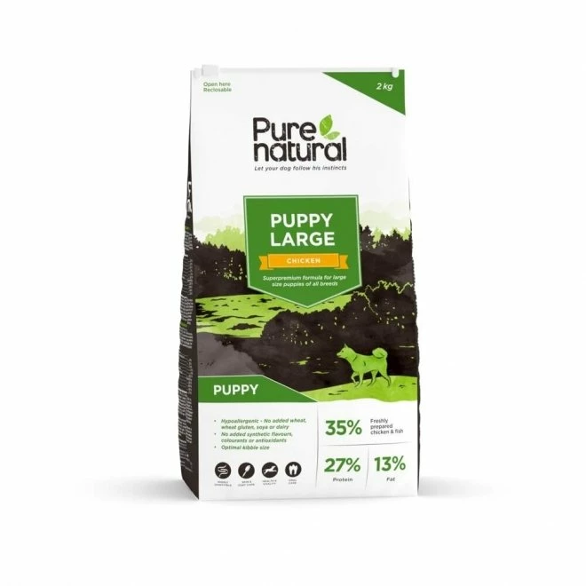Purenatural Puppy Large er et komplett fullfôr med smak av kylling, for større valper og unge hunder opp til 12 måneder. Fôret passer de fleste større raser. Purenatural Puppy Large har et høyt innhold av kjøtt, som gjør det til et fôr tilpasset våre kjøttetende venner. Det høye kjøttinnholdet gjør at foret har et optimalt innhold av fett og protein for den voksende valpen.