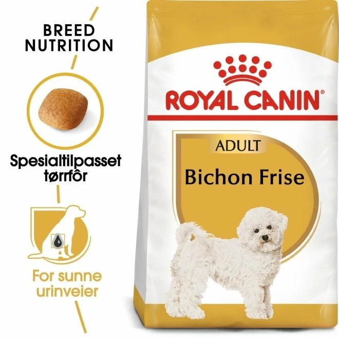 Royal Canin Breed Bichon Frise Adult er et kompletteringsfôr til Bichon Frisé-hunder fra 10 md og oppover. Hjelper med å holde urinveiene friske. Man må også oppmuntre hunden til å drikke rikelig for å få tynnet ut urinen. Støtter opp om hudens rolle som «en beskyttende mur» (en spesiell kombinasjon av næringsstoffer), hjelper hunden med å holde huden frisk og sunn (EPA&DHA, A-vitamin) og nærer pelsen. Tilsatt agurkurtolje. Maten hjelper hunden med å holde idealvekten. Kalsiumbinderne som er tilsatt i maten forebygger dannelsen av tannstein.