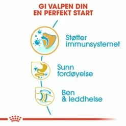 Fôret ineholder en eksklusiv kombinasjon av næringsstoffer som fremmer en sunn fordøyelse og balansert tarmflora noe som bidrar til å fremme valpens mage- og tarmhelse. Fôret hjelper også til å holde valpens idealvekt og bidrar til bra mineralisering av skjelettet takket være balansert energi og mineraler (kalsium og fosfor). Dette styrket benstrukturen og ledd.
