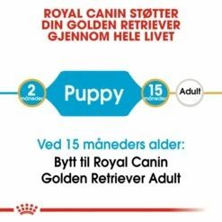 Royal Canin Breed Golden Retriever Puppy er et hundefôr som er spesielt tilpasset for golden retriever og lignende hunder som er yngre enn 15 måneder. Fôret bidrar til å styrke og bygge opp golden retrieverens pels, blant annet gjennom sin optimale balanse mellom omega 3 og omega 6. Royal Canin Breed Golden Retriever Puppy bidrar til å styrke valpens naturlige immunforsvar og fremmer en god utvikling av både muskler og ledd gjennom tilsetning av blant annet glykosamin.