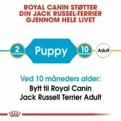 Royal Canin Breed Jack Russell Puppy er et fullfôr spesielt beregnet for Jack Russellterrier-valper til de er 10 md gamle. Voksetiden til de aktive Jack Russellterrierne er kort og intensiv. Takket være et tilpasset energiinntak samt et ideelt protein- og mineralinnhold gir maten valpen en balansert vekst. Formen, størrelsen, strukturen og sammensetningen til pelletene er tilpasset Jack Russellterrier-valpenes behov. Sammensetningen har en god virkning på fordøyelseskanalen og hjelper valpen med å utvikle en balansert bakterieflora. Maten styrker utviklingen av Jack Russellterrier-valpens naturlige motstandskraft.