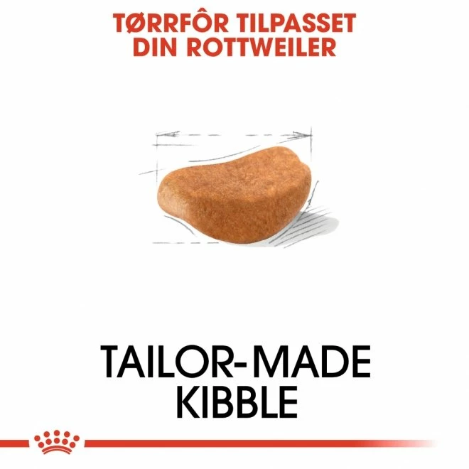 Royal Canin Rottweiler er et hundefôr som er spesielt tilpasset for rottweiler og lignende hunder som er eldre enn 18 måneder. Royal Canin Rottweiler hjelper din rottweiler å styrke sine muskler og ledd gjennom en unik sammensetning av proteiner av høy kvalitet, samt tilsetning av blant annet glykosamin. Hundefôrets biter er spesielt utformet for at rottweileren, med sin spesielle kjeve, skal stimuleres til å tygge skikkelig. Royal Canin Rottweiler bidrar til en god hjertefunksjon og tilsetningen av blant annet taurin, E-vitamin og C-vitamin gjør at din rottweilers vitalitet bevares langt opp i årene.