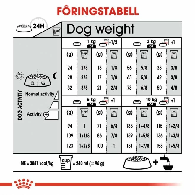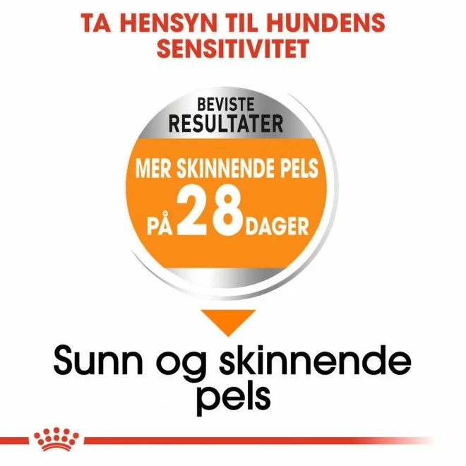 - Tørrfôr til små voksne hunder med slitt og glansløs pels.