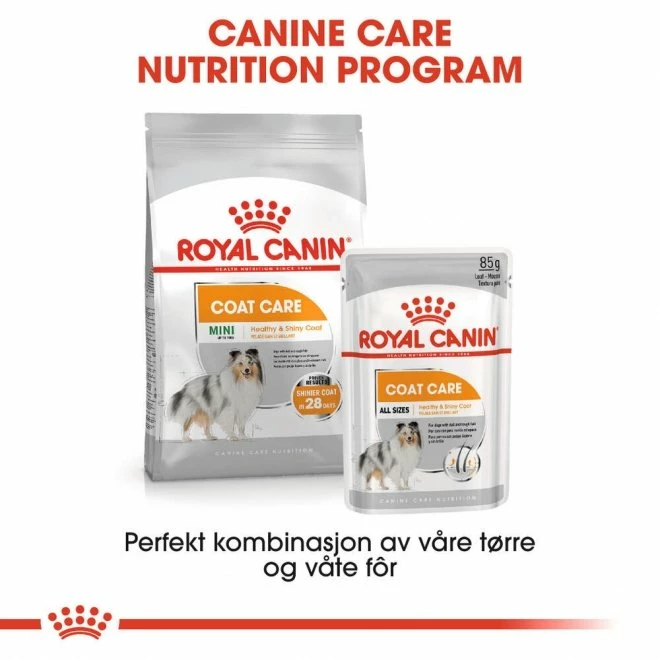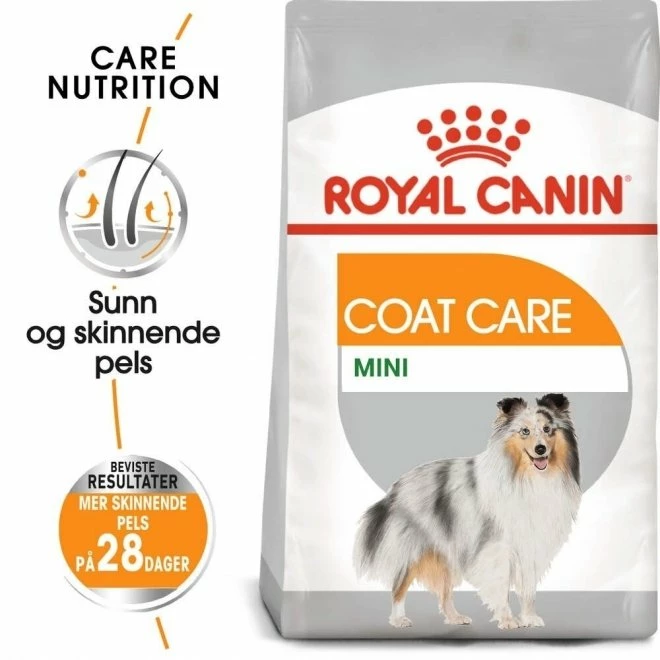 Royal Canin Coat Care Mini Adult er et helfôr av høy kvalitet til voksne hunder av små raser, opptil 10 kg. Fôret inneholder blant annet omega-3 og omega-6, og er spesielt tilpasset for å gi tett, kraftig og glansfull pels.