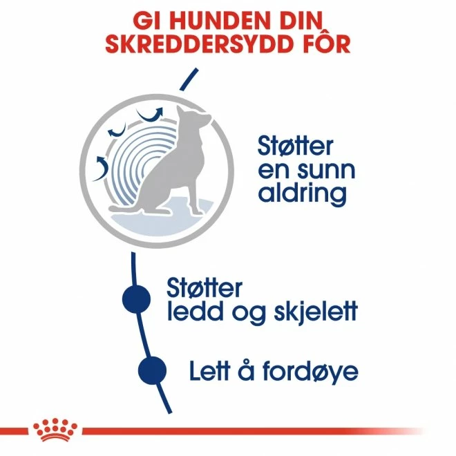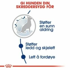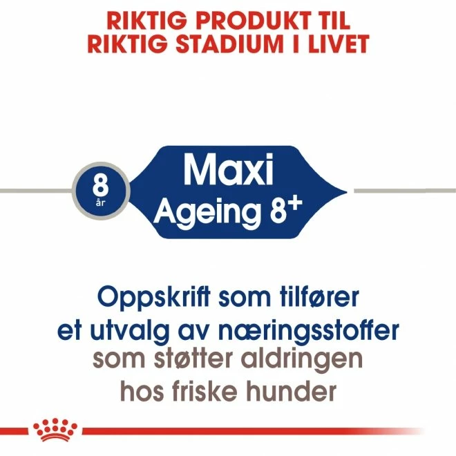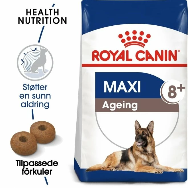 Royal Canin Maxi Ageing 8+ er et hundefôr som er spesielt tilpasset for eldre hunder (over 8 år) som veier 26-44 kg. Royal Canin Maxi Ageing 8+ produseres av proteiner av høy kvalitet som sammen med tilskudd av blant annet omega 3 og omega 6 hjelper den eldre hunden å opprettholde sin vakre pels. Hundefôrets biter inneholder stoffer som bidrar til å motvirke dannelse av tannstein og sammensetningen gjør bitene lette å bløte opp for å appellere til eldre hunder med sviktende appetitt. Royal Canin Maxi Ageing 8+ inneholder også et tilpasset nivå av fosfor som støtter den eldre hundens nyrefunksjon, samt utvalgte næringsstoffer som støtter en sunn aldring.