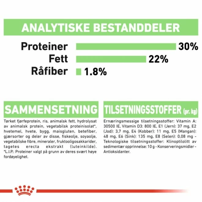 En følsom fordøyelse kan resultere i myk og illeluktende avføring, derfor har Mini Digestive Care en eksakt og balansert næringsformel som støtter en optimal tarmhelse. Innholdet av svært lettfordøyelige proteinkilder (L.I.P.), prebiotika (FOS) fremmer en balansert tarmflora og forbedrer avføringskvaliteten. Fôrets eksklusive sammensetning stimulerer appetitten selv hos de mest kresne små hundene. Fôret bidrar også til redusert dannelse av tannstein takket være natriumpolyfosfat som binder kalsiumet i spyttet.