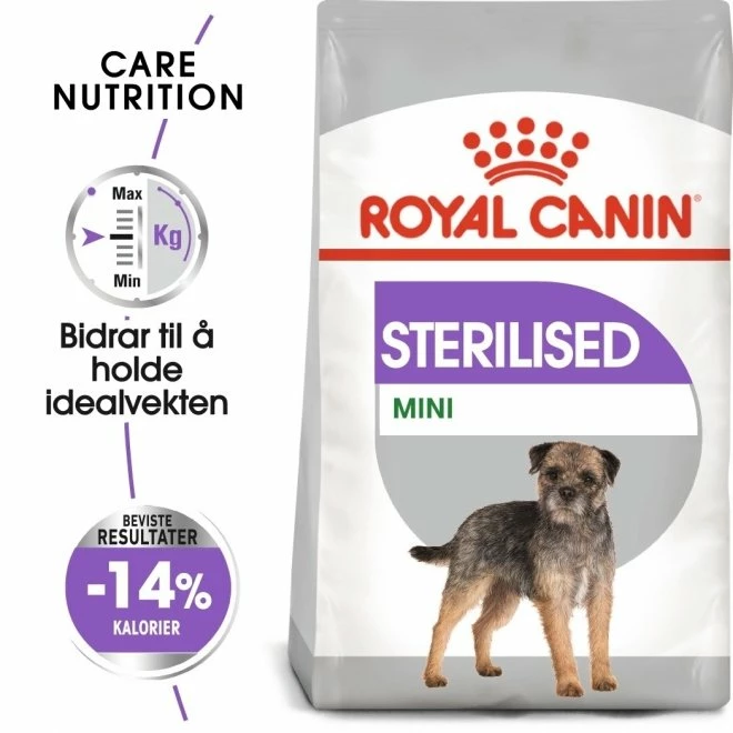 Royal Canin Mini Sterilised, Et fullfôr til voksne, kastrerte/steriliserte små hunder (1-10 kg), for vektkontroll. For over 10 md gamle hunder. En riktig daglig dose og sammensetning med et høyt proteininnhold (30 %) og lavt fettinnhold (13 %) samt L-karnitin, som hjelper kroppen til å utnyttet fettstoffene, hjelper kastrerte hunder med å holde idealvekten.