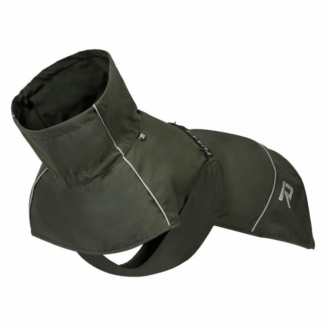 Regndekkenet er komfortabel å ha på og kjennes lett. På innsiden er det et pustende meshstoff. Det dekker godt og kan justeres på flere måte for å passe en rekke forskjellige hunder; både kragen, midjen og rygglengden er justerbar. På toppen er det en glidelåsåpning for at du lett kan feste båndet til en sele. Dekkenet har også elastiske stropper til beina, sånn at det holder seg på plass også i høy aktivitet. Fordi dekkenet er utstyrt med en spenne, er det lett å ta av og på hunden.