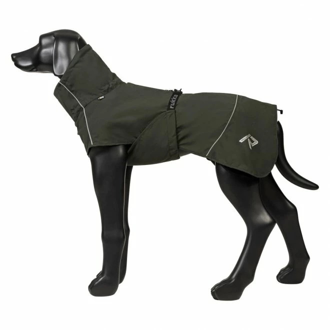 Rukka Hayton Ecco regndekken er laget av resirkulert materiale og er vanntett og vindtett. Det er enkelt å holde ren og tørker raskt, noe som gjør det praktisk for gjørmete skogsturer i tillegg til vanlig regnvær. Dekkenet er spesielt egnet for vår og høst. Det har en pen grønnfarge og refleksdetaljer.