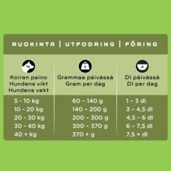 Fôret har mye smak og inneholder fersk kylling av finsk opprinnelse. Fôret har et lavere fettinnhold og et lavere energiinnhold enn et vanlig voksenfôr.