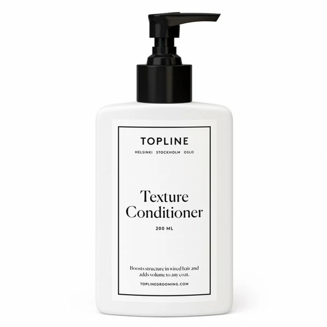 Topline Teksturbalsam er en balsam som gir tekstur og luftighet til stiv og krøllete pels som mangler volum. Balsamen passer til grovere pelser (f.eks. Schnauzer), krøllete pels (f.eks. Puddel) og pels som trenger tekstur (f.eks. Bearded Collie) eller volum (f.eks. Old English Sheepdog).