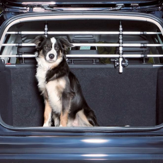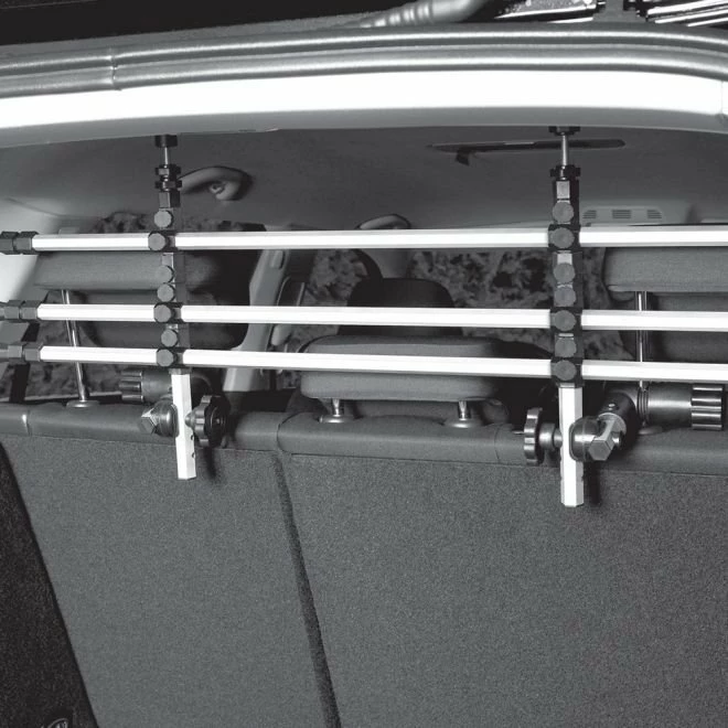 Ett gitter i aluminium og plast som ikke tar ekstra plass. Du fester gitteret bak baksetets nakkestøtte og har dermed hele bagasjerommet ditt tilgjengelig. Uansett om du transporterer husdyr eller verktøy så ligger de sikkert i bakluken mens du kjører.