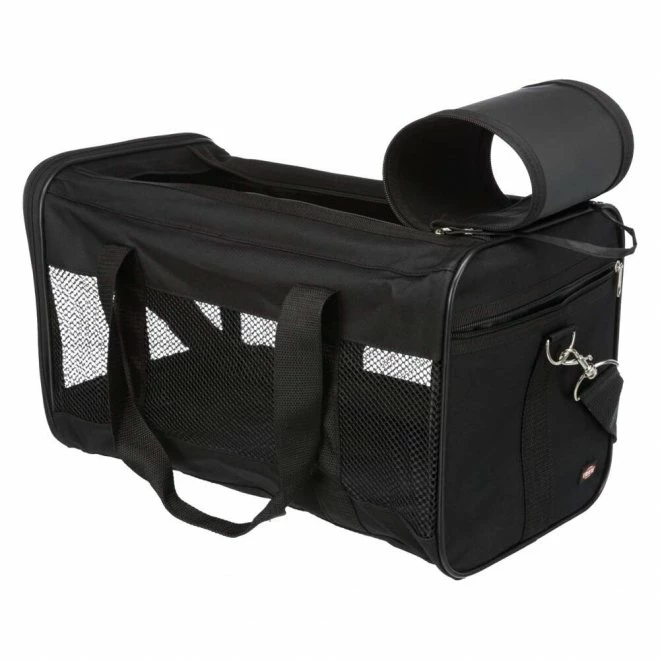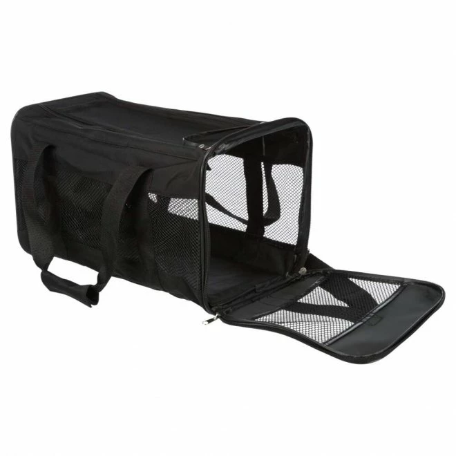 Trixie Ryan transportbag, som kan åpnes øverst og foran. Bagen har en utstyrslomme samt en avtagbar skulderreim. Inni bagen finner man en kort kobbel, som man kan feste til kjæledyrets halsbånd eller sele, som hindrer kjæledyret i å hoppe ut av bagen. Nettingveggene gir god ventilasjon og gjør det mulig å følge med i omgivelsene. Kjæledyrets vekt maks. 9 kg. Farge svart. Størrelse: 26 x 27 x 47 cm